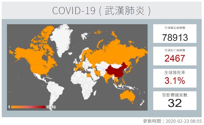 目前疾病管制署公告因COVID-19(武漢肺炎)全球確診病例數已達78,913人次,並逐月攀升中,鄰近韓國及日本也發生無海外旅遊史感染病例。臺灣目前也已 發生群聚感染病例並已有死亡之情事發生。 目前世界各國於外交部領事事務局公告其中東南亞各國包括日本、緬甸、菲律賓及韓國等國家也陸續發布紅色及橙色警示,薦國人暫勿前往旅遊。