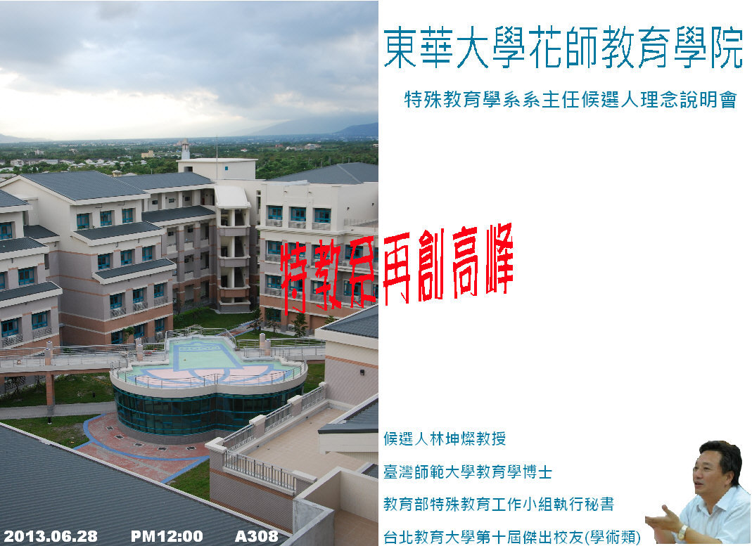 國立東華大學花師教育學院特殊教育學系系主任遴選委員會暨候選人理念發表會會議於102年6月28日(星期五)中午12時至13時30分舉行,候選人林坤燦教授以5票全數通過,當選特教系主任。 ![]() 瀏覽數